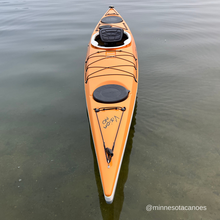This nimble 14’ kayak is perfect for day trips and overnight adventures. The Vision 140 bridges the gap between recreational kayaks and full-sized sea kayaks. It has enough speed for coastal adventures, enough storage capacity for overnights and weekend trips, and loads of stability. Visions have a generously sized keyhole cockpit that allows for easy entry and exit, plenty of footroom for larger paddlers and a faceted deck design that makes it easy to reach the water with your paddle. A retractable skeg allows you to tune the performance of the Vision 140 giving you the option to choose more maneuverability or better tracking depending on conditions. Lightweight and easy to cartop, the Vision 140 is the perfect choice for touring paddlers looking to downsize from a heavier kayak or upgrade from a recreational design. The Vision 140 is constructed from a vacuum bagged composite hybrid material, which allows for an unsurpassed combination of light weight, stiffness, toughness and value. Includes skeg.